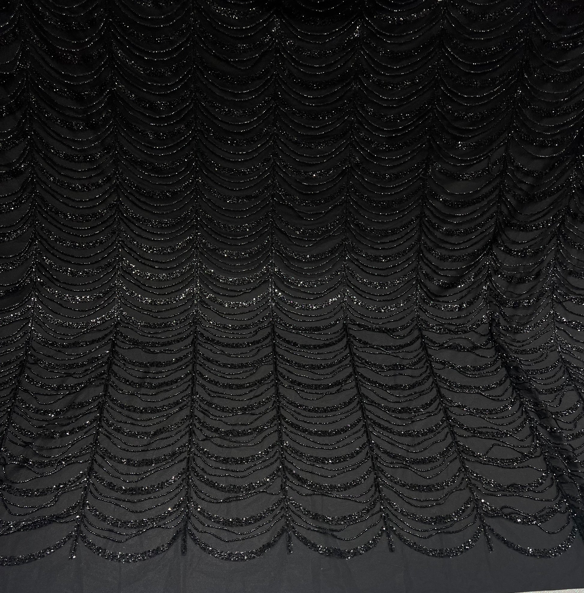 Exquisite black hand-embroidered net featuring intricate string and sequin detailing.