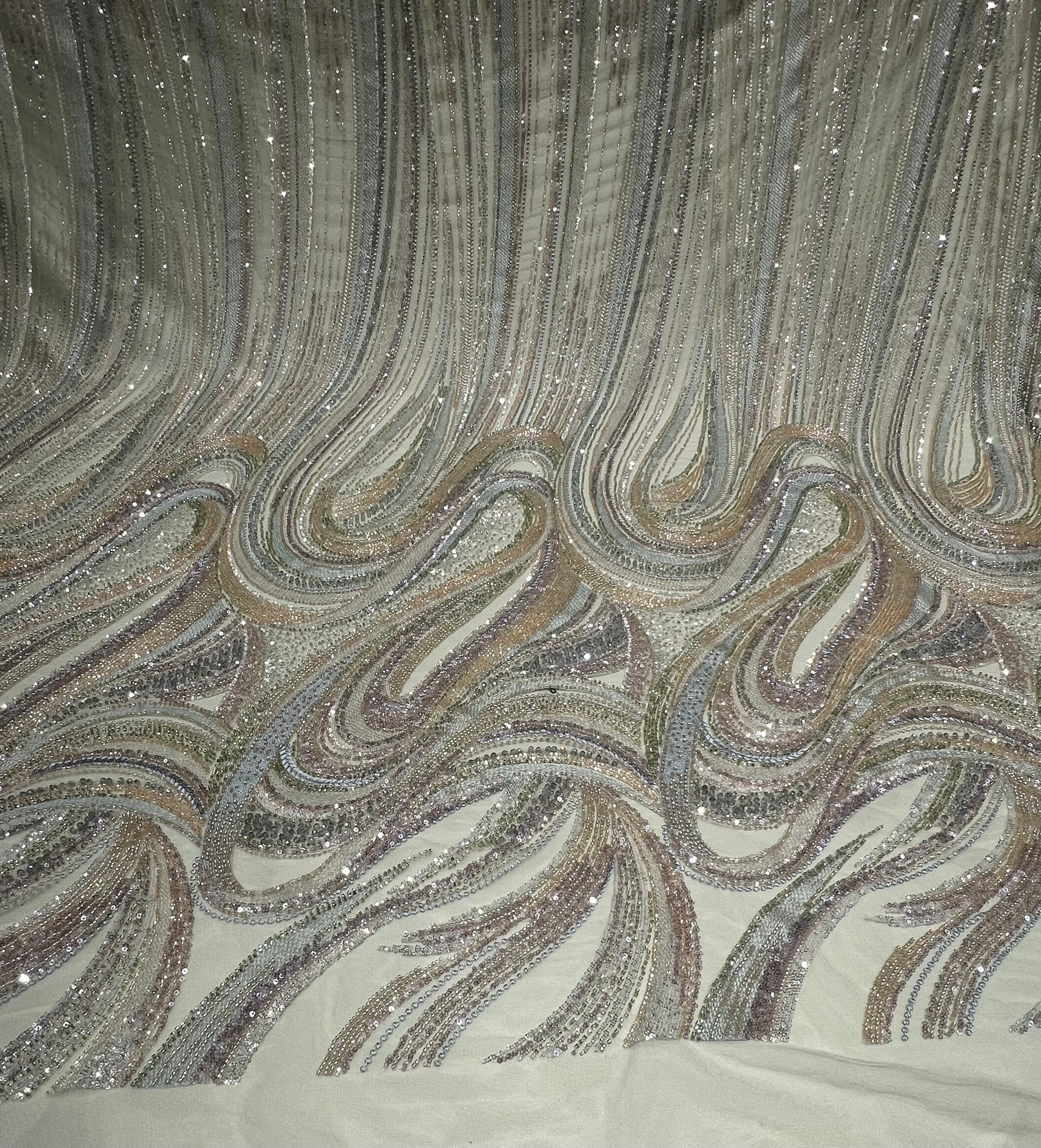 An elegant net fabric adorned with intricate swirl patterns, beautifully highlighted with shimmering sequins and fine bead detailing. The flowing, wave-like embroidery creates a luxurious movement effect, making it perfect for statement ethnic and fusion outfits. The subtle blend of champagne, silver, and pastel tones adds a soft yet glamorous appeal, ideal for festive wear, receptions, cocktail outfits, and designer ensembles.
