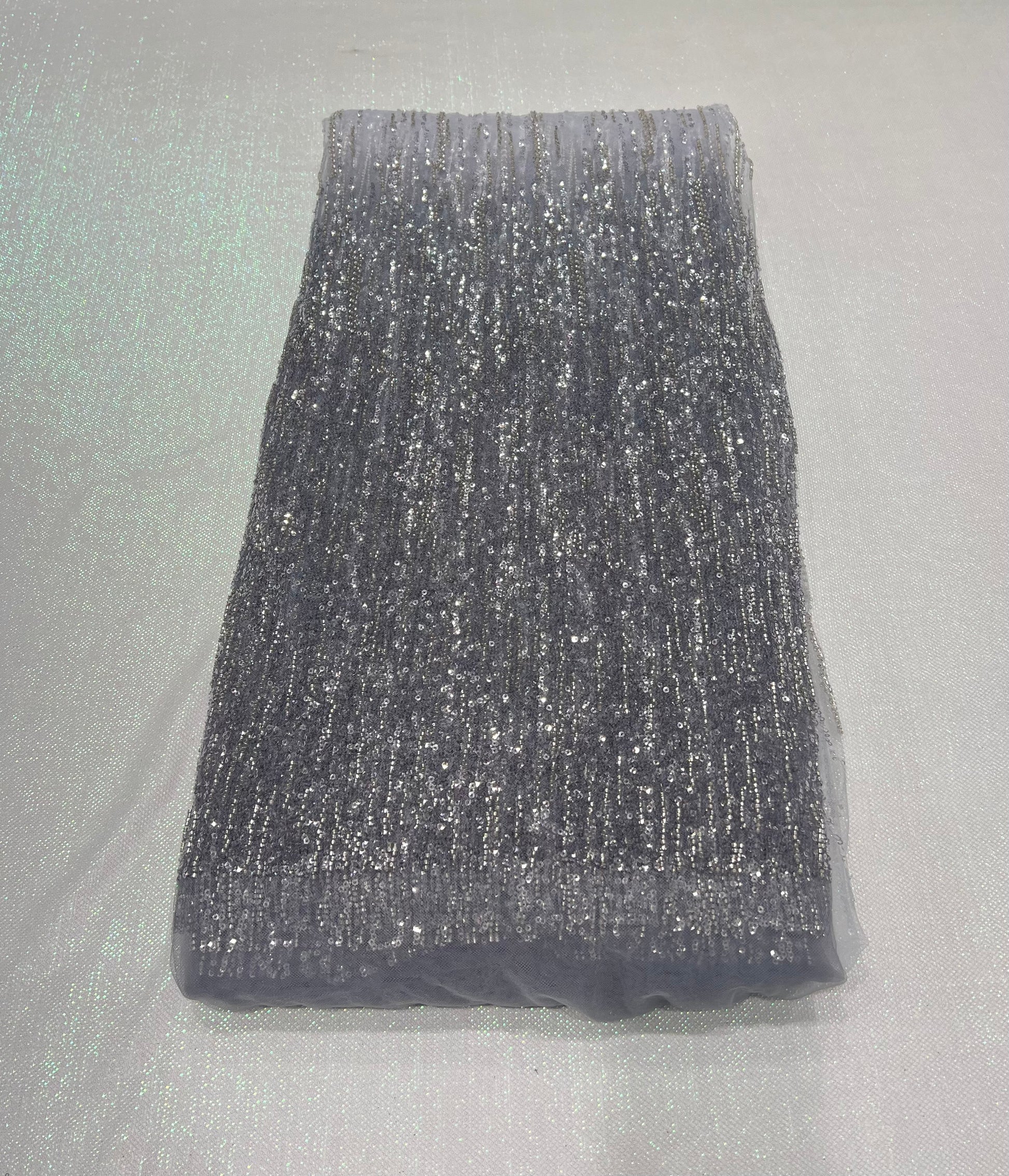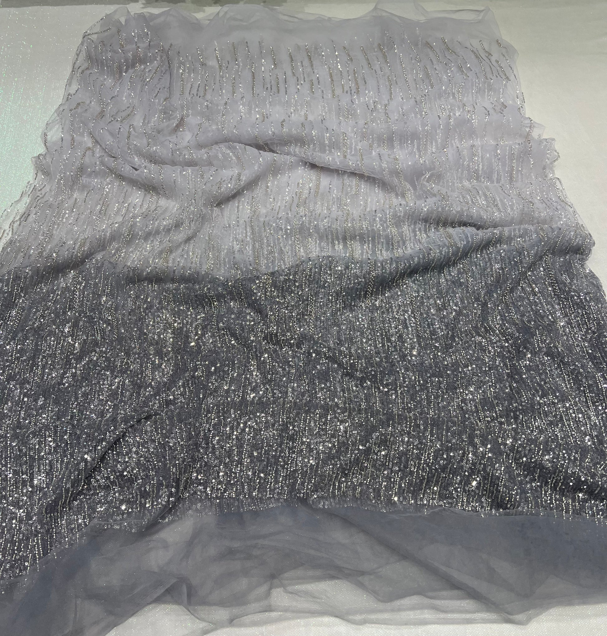Elevate your look with our Raindrop Ombré Greyish Silver Net Fabric. Hand-embellished with shimmering cutdana embroidery in a cascading raindrop pattern. A perfect blend of elegance and sparkle for sarees, gowns, and evening wear.